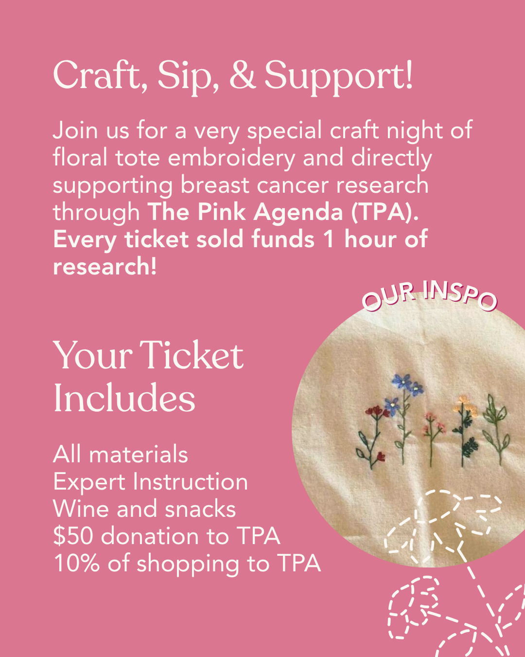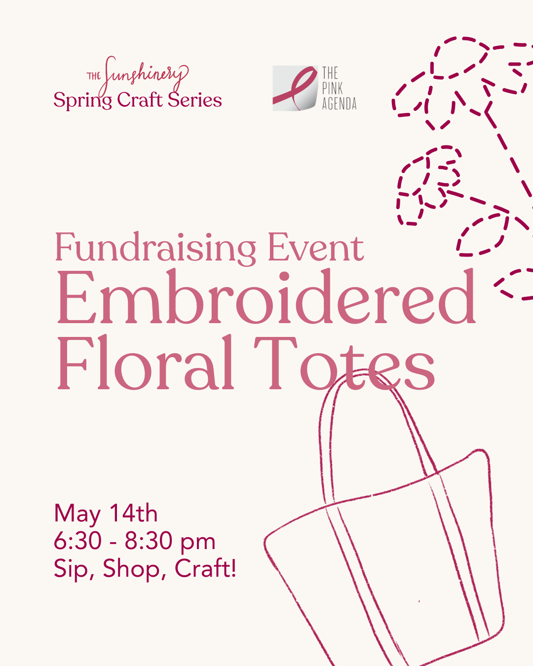 Every season, The Sunshinery hosts a craft + sip fundraiser for an organization we love. This spring, we are excited to host Embroidered Floral Totes with The Pink Agenda.