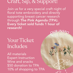 Tickets include all materials, instruction, wine, and snacks. Plus for fundraiser: $50 of all ticket sales plus 10% of all in-store sales will go directly to The Pink Agenda. Every ticket sold funds 1 hour of research!