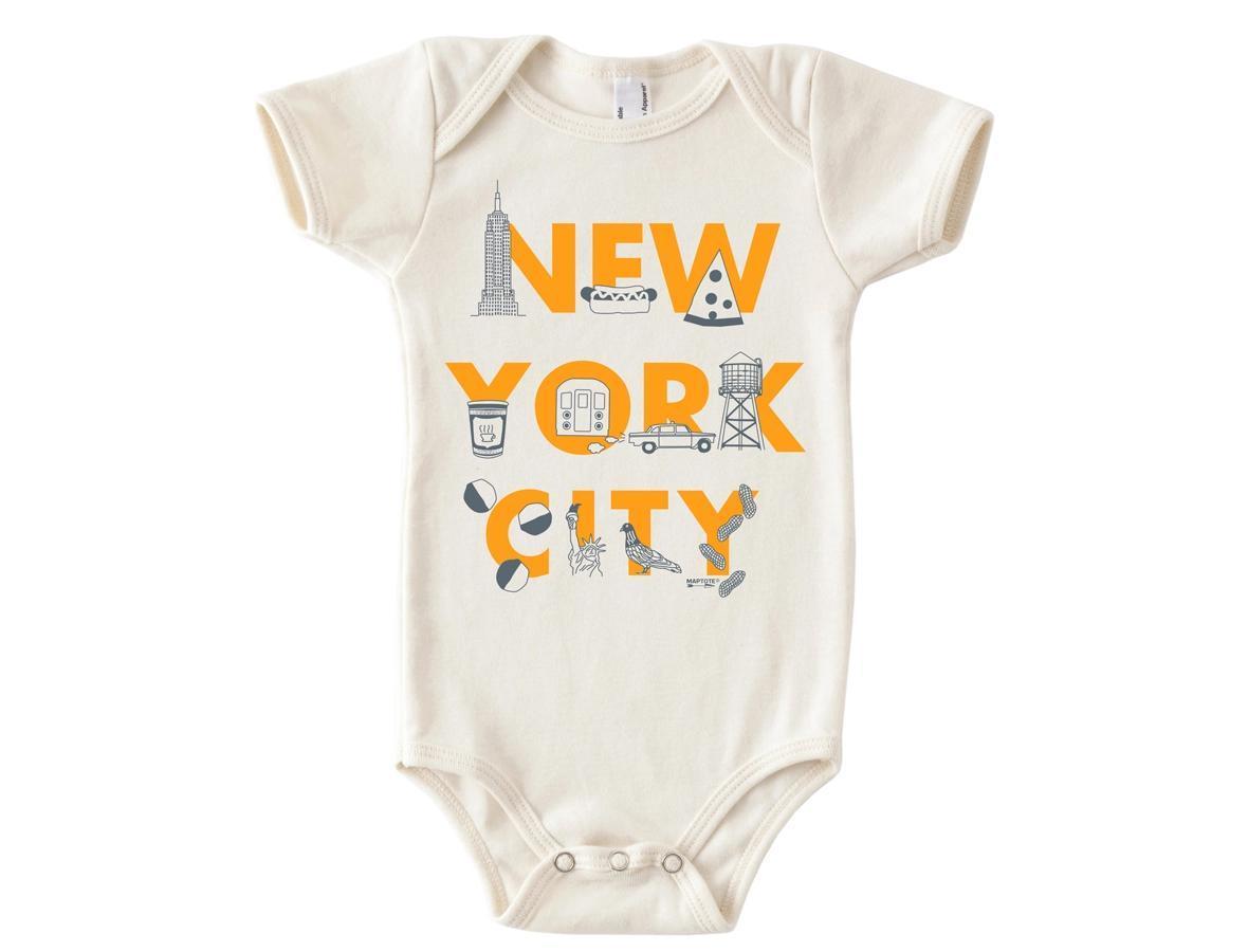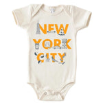 New York City baby one-piece with bold NYC typography. Made from 100% organic cotton, USA made, and perfect for baby boutiques and city-themed gifts. Made from 100% cotton and printed in Brooklyn, NY, this baby one-piece features playful “New York City” typography that captures the energy and spirit of NYC.