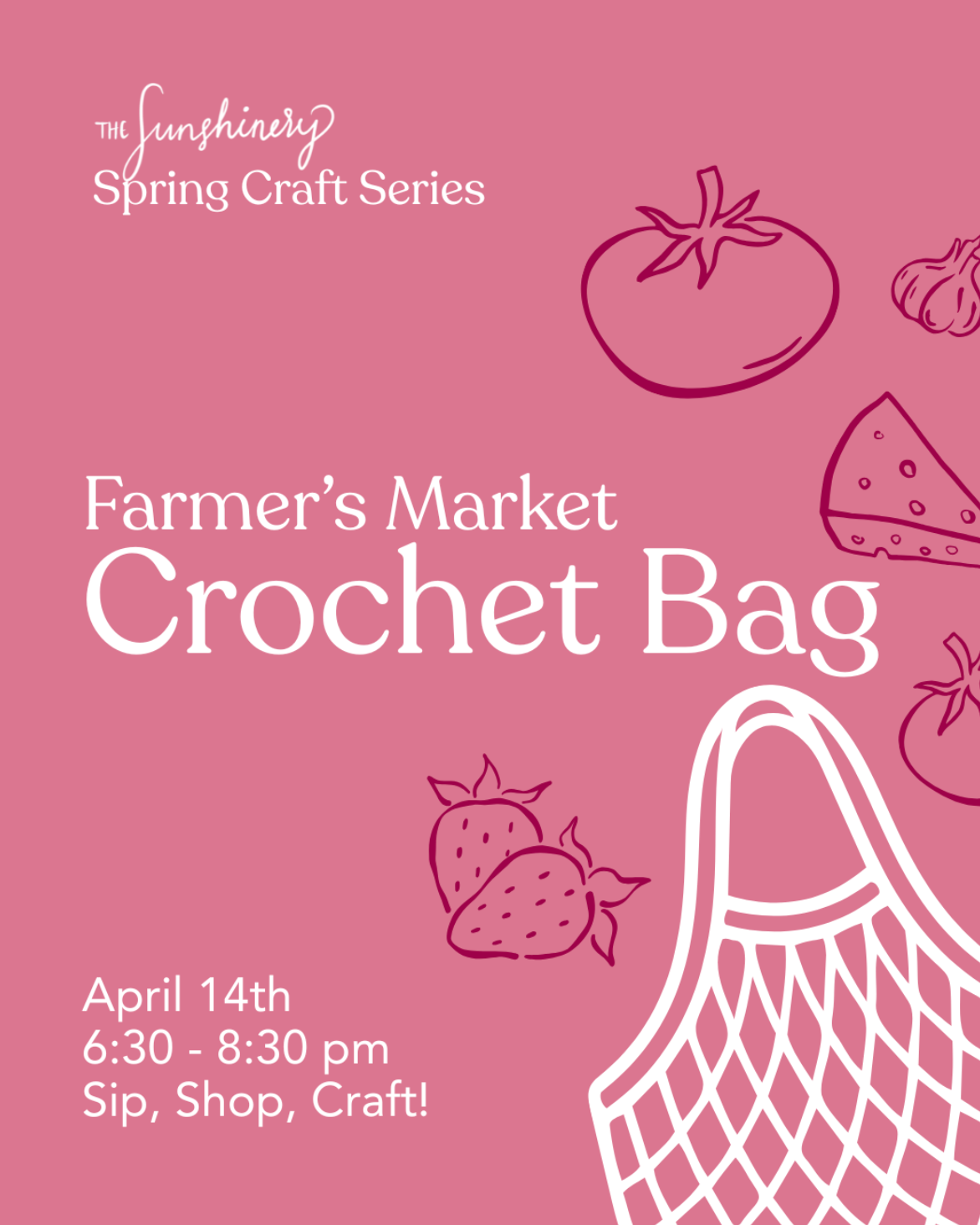 Join us on the Upper West Side for our April sip & craft event "Farmer's Market Crochet Bags". Learn how to crochet your very own market tote to use next time you hit the local farmer's market. Led be crochet enthusiast Brooke F. - it’s the perfect spring activity.